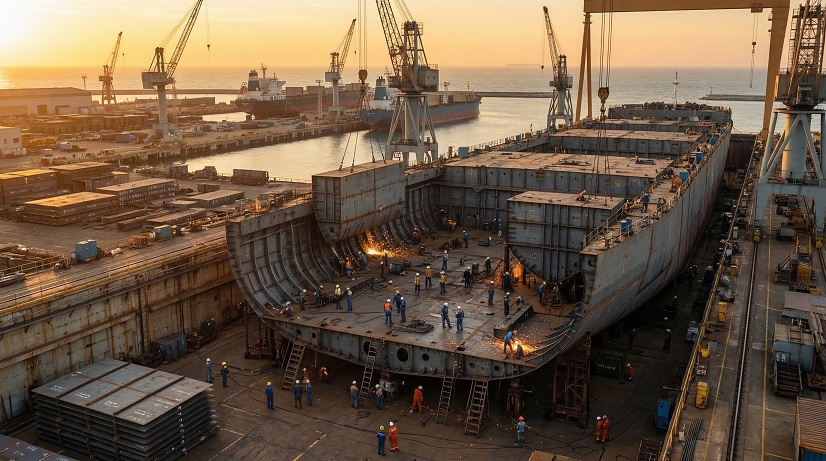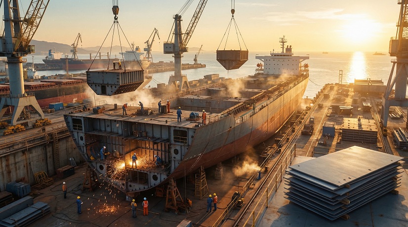 Steel used for ship structures, marine fabrication, cargo equipment, and dock infrastructure.